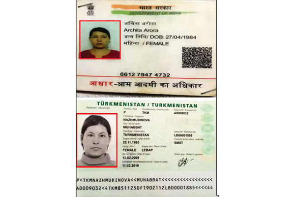 बाएं – मृतका के कपड़ों से बरामद अर्चिता अरोड़ा नाम का आधार कार्ड तथा नीचे उस का तुर्कमेनिस्तान का पासपोर्ट